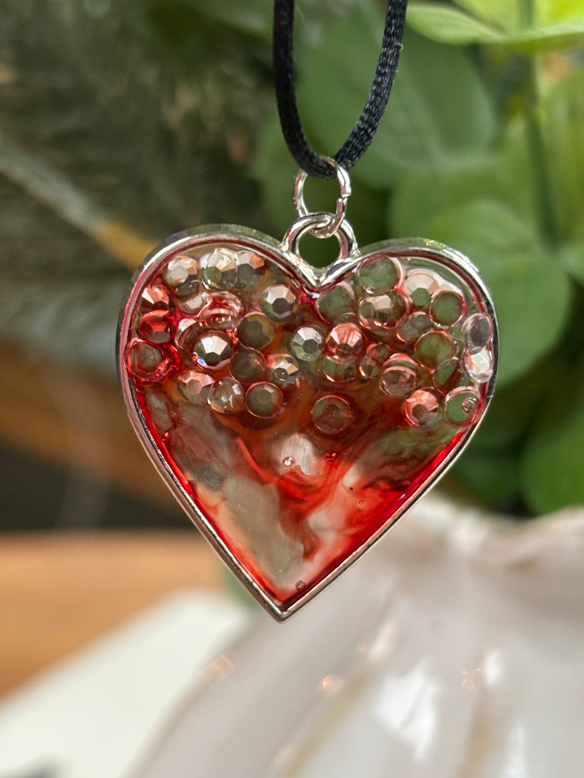 This handmade resin necklace features a vibrant red heart charm with a glossy finish that catches the light beautifully. The charm is paired with a soft black satin nylon string, 20 to 24 inches for a comfortable and versatile fit. Lightweight and easy to wear, this necklace adds a simple pop of color and a touch of handmade charm to any outfit. Perfect for everyday wear or as a meaningful gift, each piece is carefully crafted and one of a kind.